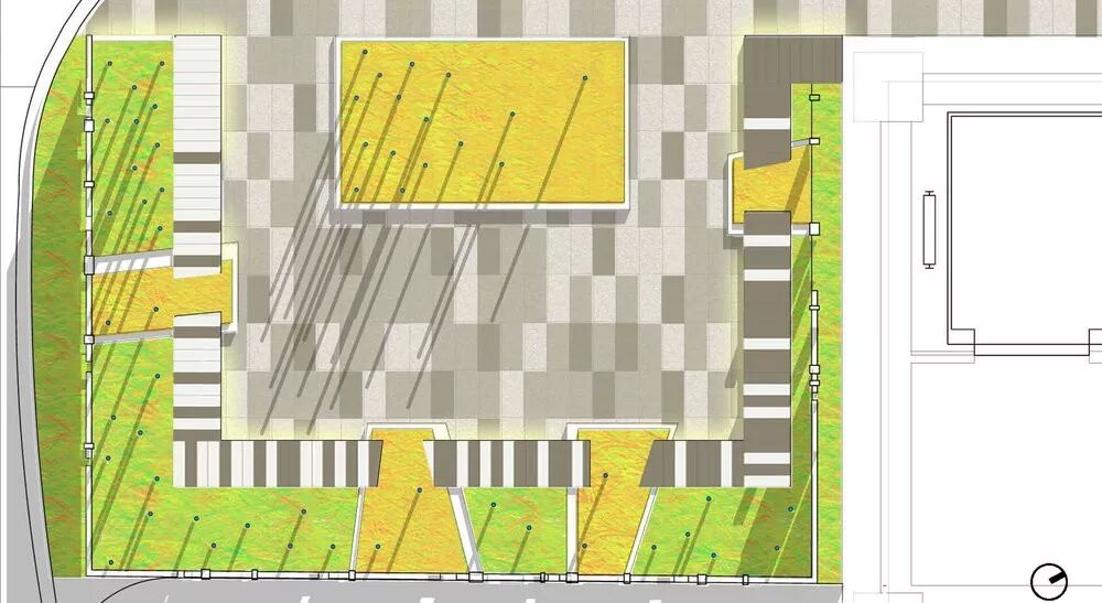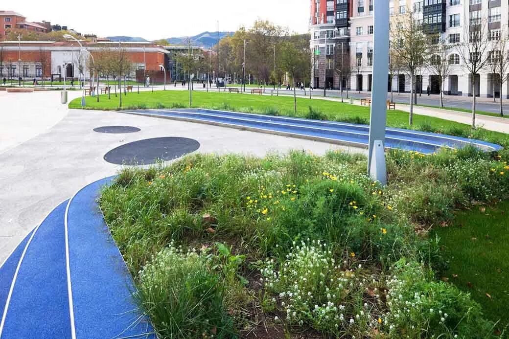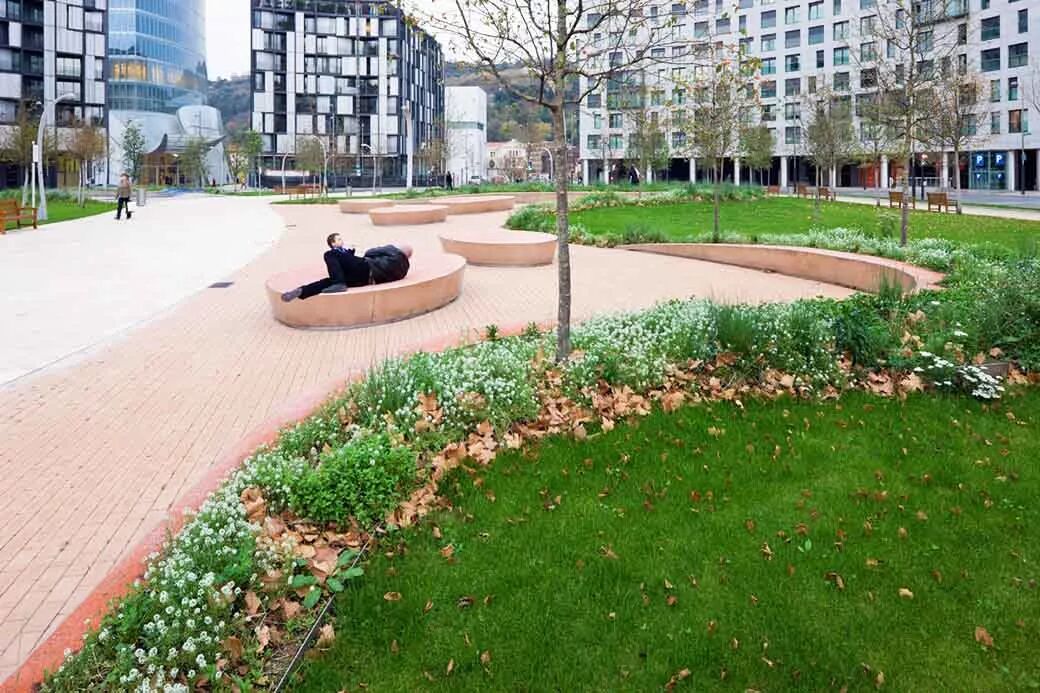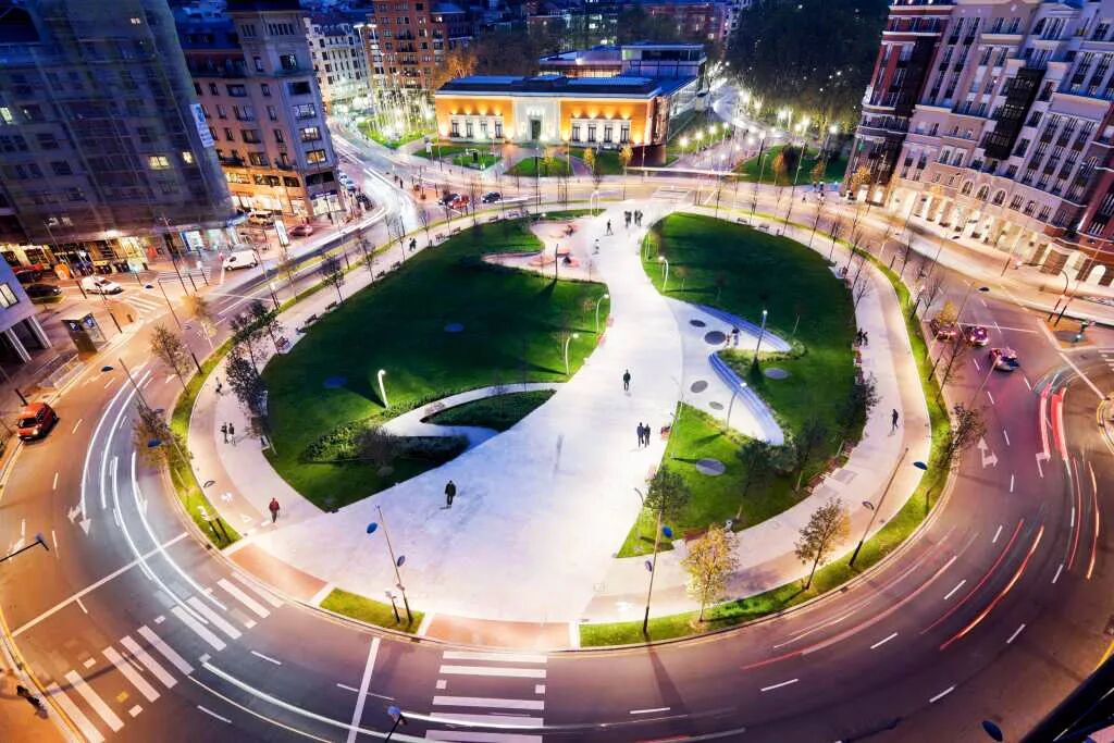 广场中心流畅的路径汇聚了来自四面八方的动能。绿树成荫,开放流通的边界支持人们沿边闲坐。中心三个口袋公园特色迥异,适合各种休闲。广场一部分的下方是100车的地下停车场。因为西班牙经济衰退,所以造价减少,设计取消了原有的喷泉,更繁多的植被和某些材料。