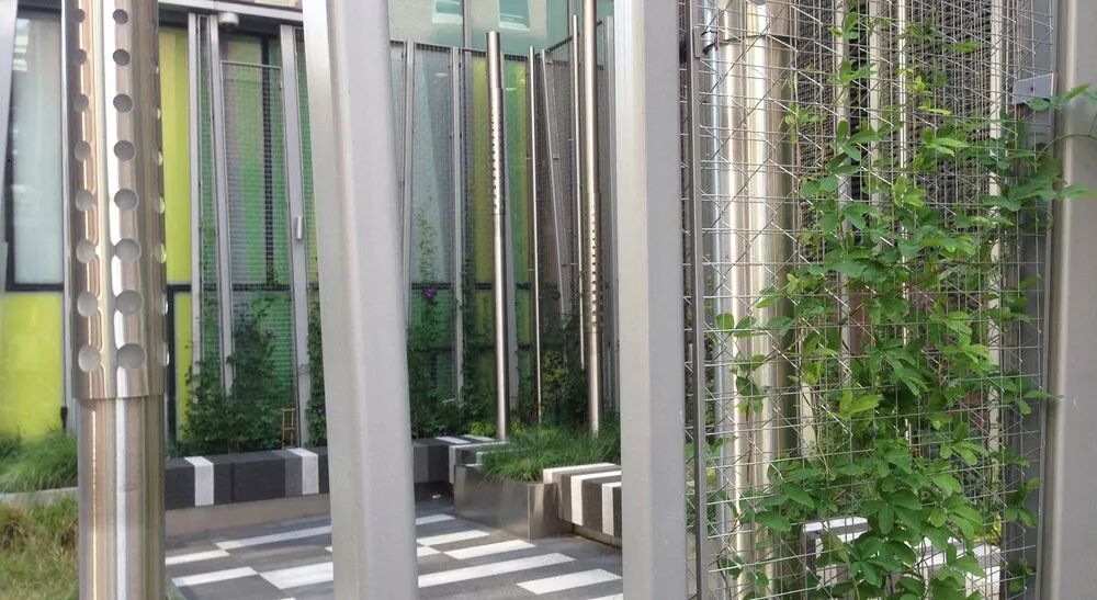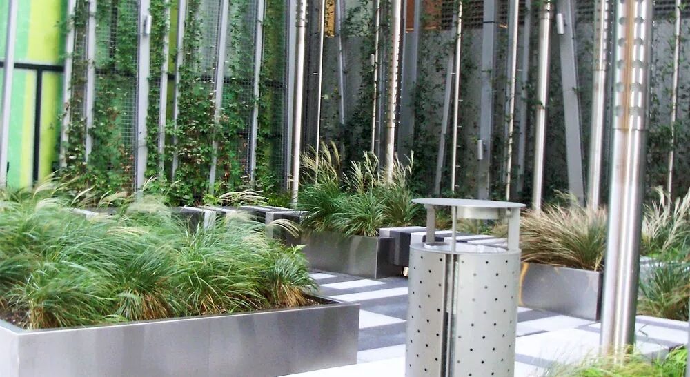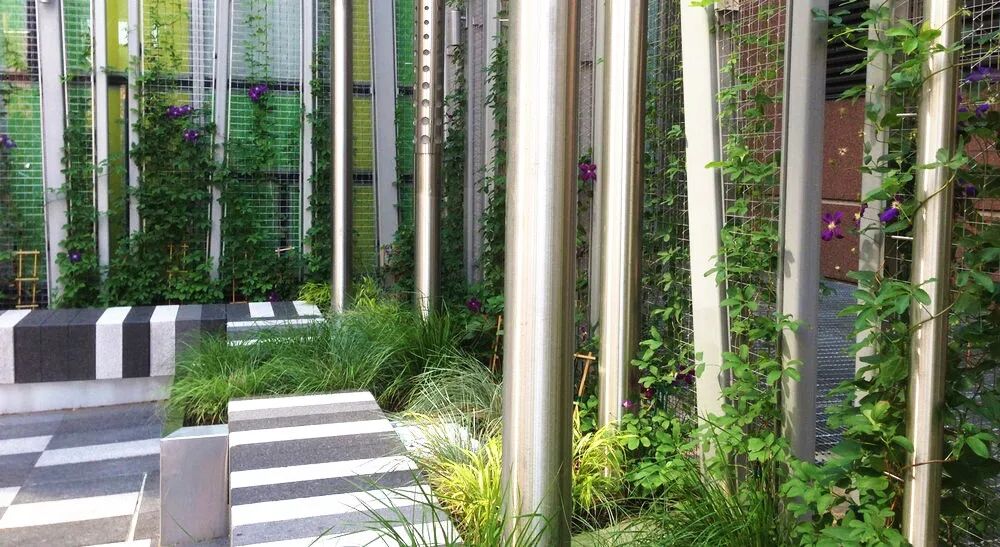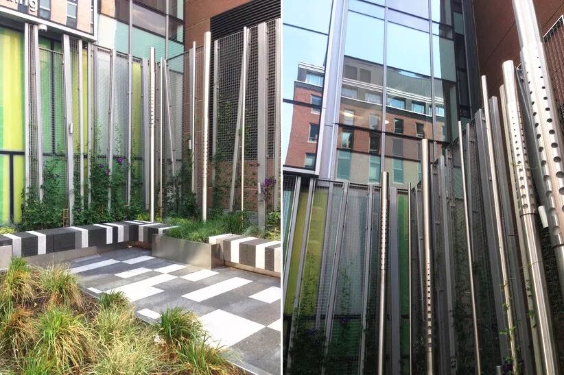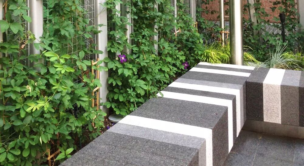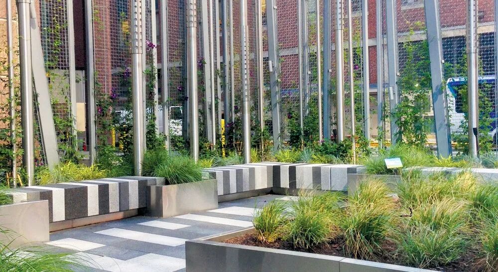 这是位于波士顿马萨诸塞州一个儿童医院的口袋公园,由Landworks Studio负责景观设计。设计师将花岗岩变成了一个个长凳,沿着口袋公园的边缘,设计师使用黑白相间的像素化图案。口袋公园将语言延伸为三维形式,在种植床中增加了垂直绿化,以及金属柱。