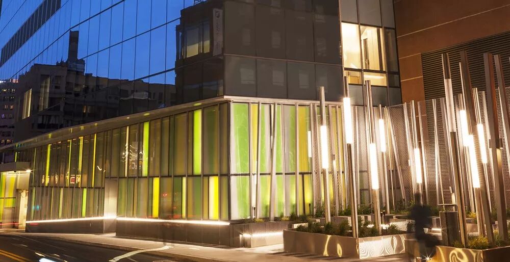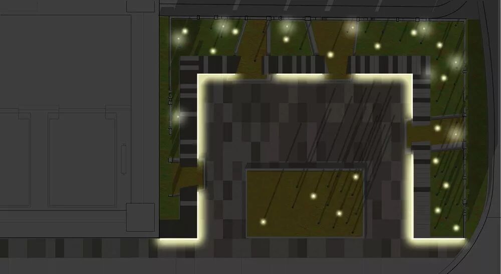 公园的亮点是6米高的水幕墙瀑布,作为整个空间的背景,也是为了在这个公园当中的增加一个视觉焦点。到了夜晚,跌水后面的灯光布景,为小公园又增添了一抹神秘的色彩。