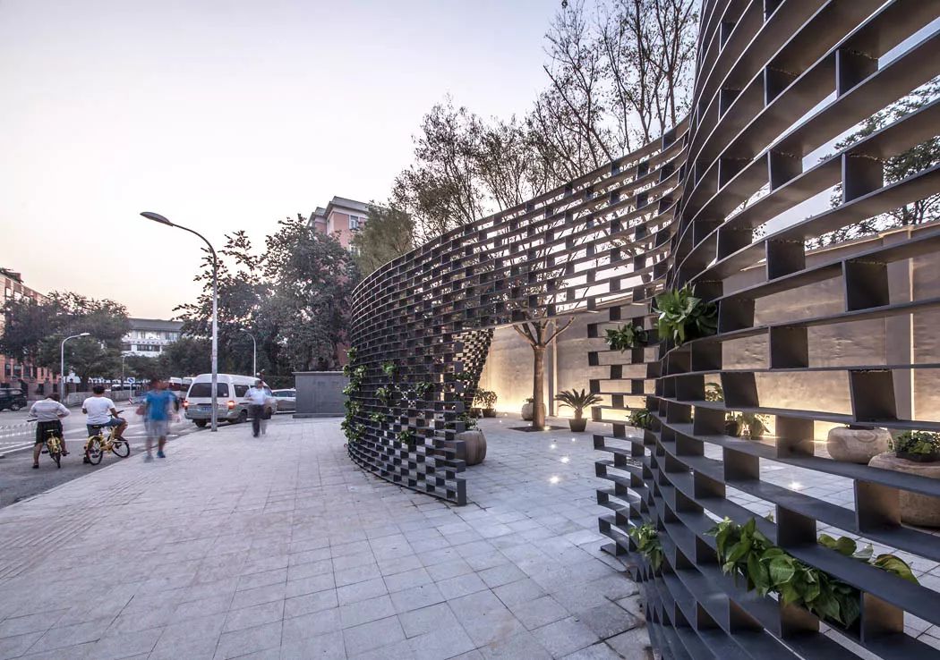 设计师在距离较小的位置,采用了平直的处理,与两侧实体墙相连接。在距离较大的位置,采用了曲面的设计,使路过此处的人们能有更多的角度进行观赏。而划分比例较大的“墙上痕”在较远的地方观察或者直视时,通透性非常好,视线完全可以直抵后面的老墙体,呈现消失的感觉。