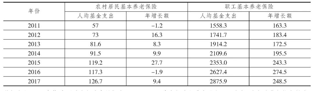 表3 2011~2017年职工与新型农村社会养老保险人均基金支出(元)