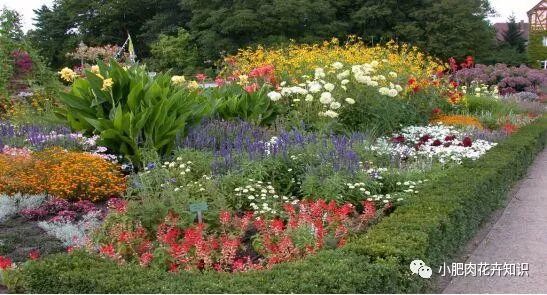 (4)花境中的植物都是生长容易、不需要特殊照顾的种类,开过花后凋萎或死亡,旁边的枝叶会长过来掩遮地面;