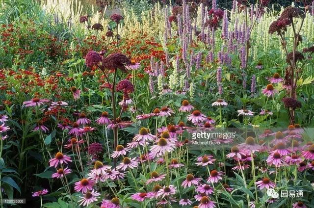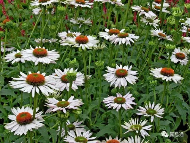 松果菊最具有观赏性的就是,高高低低散布的花朵,朵朵欲冲向天,每一朵花宠宠欲动的感觉,每一簇花高低错略形成的天然层次空间感,不仅仅是型,也是色彩的空间分布。松果菊勃勃生机,是点缀观赏草花境,增光提色的绝配材料。松果菊品种多,花色丰富,可以选择纯色,也可以选择混色,但不要栽植太过于稠密,松果菊展示花朵效果,需要空间稀疏一点,需要和观赏草叶片互相掩映,这样的观赏草花境才不致于浓妆艳抹,落入俗套。