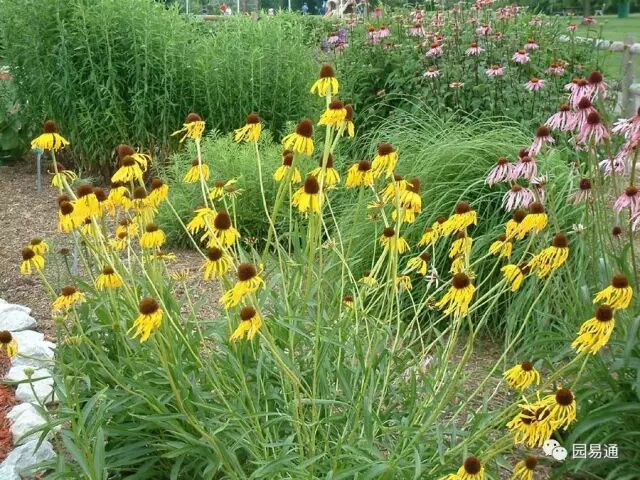 黄色和白色也许是最亮眼的颜色,但黄色不同于白色的是,需要配置其他同样热烈但不刺眼的如紫色、粉色和粉红色等色系花,来进行色彩对冲调和。仅仅一簇黄色在观赏草花境中不是最佳选择,与整个群体色彩是背离的。