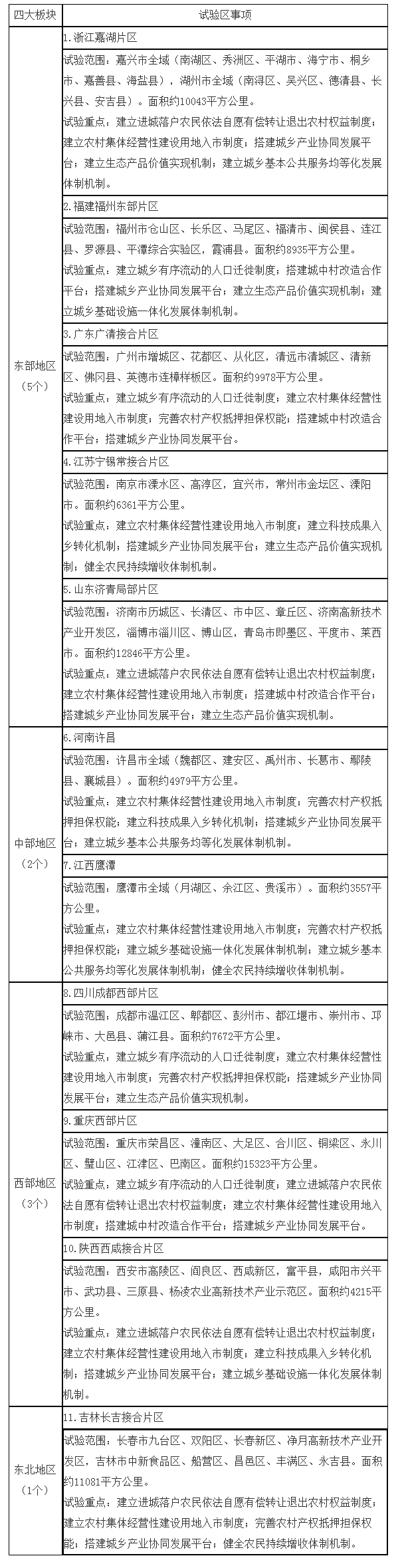 (四)加强政策集成。有关部门要在试验区开展国家农村产业融合发展示范园、农民专业合作社质量提升整县推进试点、民营企业下乡发展试点等;支持客流有需求、财力能支撑的试验区利用既有铁路资源开行市域(郊)列车,实施市域(郊)铁路新建项目;支持试验区内符合条件的涉农企业上市挂牌融资、村镇银行设立、村级综合服务平台建设、乡村教师生活补助提标、中等职业学校建设、“特岗计划”实施等。试验区所在省级人民政府在申报以上试点及全域土地综合整治试点等时,要优先支持试验区;在分配新增建设用地指标时,要倾斜支持试验区。