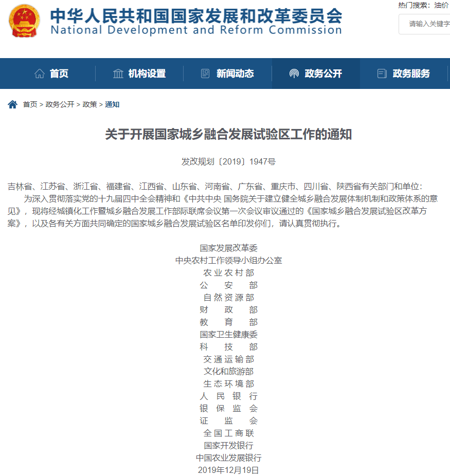 (二)建立省部共担机制。国家发展改革委要依托城镇化工作暨城乡融合发展工作部际联席会议制度,统筹协调试验区重大事项。中央农办、农业农村部、公安部、自然资源部、财政部、教育部、卫生健康委、科技部、交通运输部、文化和旅游部、生态环境部、人民银行、银保监会、证监会、工商联、开发银行、农业发展银行等成员单位要分头抓好政策支持保障。试验区所在省级人民政府要成立省级城镇化工作暨城乡融合发展工作领导小组,省级有关部门和试验区所在的各地级及以上城市党委或政府主要负责同志参加,整合力量支持试验区改革探索,并以地方性法规等方式固化改革成果。