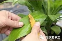 2、一手捏住叶片,一手用香蕉皮的内侧擦拭叶片,别忘了叶片的背面也要擦到哦,这样叶片就会变得光亮如新。