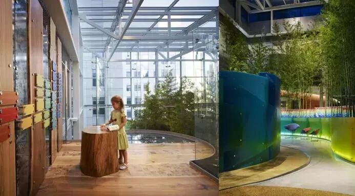 而对与部分可以活动的患者来说,既可在内庭院进行恢复锻炼,也方便医务人员定位观察防止意外发生。这类景观设置极大的方便患者,也丰富了建筑内部的使用功能。