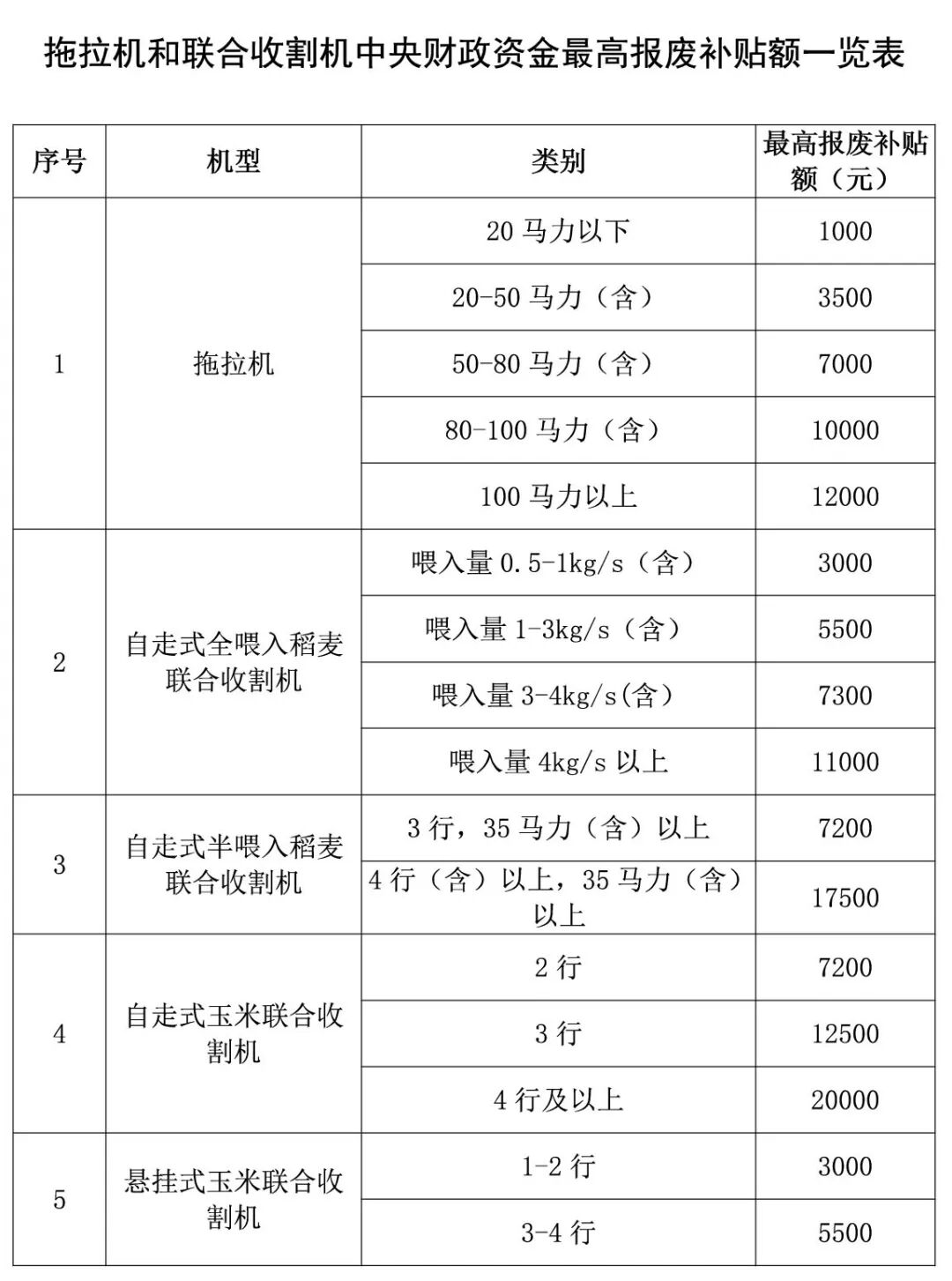 中央财政农机报废更新补贴由报废部分补贴与更新部分补贴两部分构成。报废部分补贴实行定额补贴,补贴额由省级农业农村部门商财政部门确定。拖拉机和联合收割机报废补贴额不超过农业农村部发布的最高补贴额(详见附表1),各省可在此基础上归并或细化类别档次,确定具体补贴额。其他农机报废补贴额原则上按不超过同类型农机购置补贴额的30%测算,并综合考虑运输拆解成本等因素确定,单台农机报废补贴额原则上不超过2万元。在多个省份进行报废补贴的农机,相邻省农业农村部门应加强信息沟通,力求补贴额相对统一稳定。更新部分补贴标准按农机购置补贴政策相关规定执行。