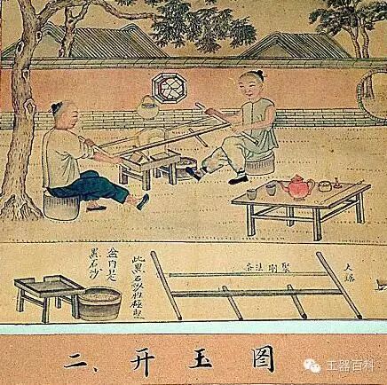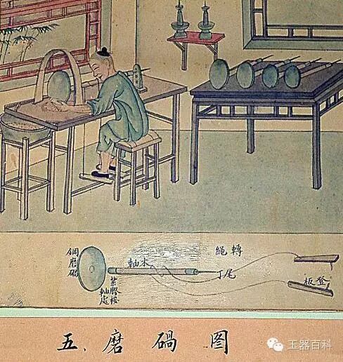 故宫博物院玉器馆有《制玉图》一套,是清光绪十七年李澄渊所绘《玉作图》,共 12 副。制玉图风格写实,记录描绘出制玉的主要步骤。每图分上下两部分。上部描绘出制玉的手法,下部描绘出此手法所使用的工具。注解:“碢tuó”古同“砣”。