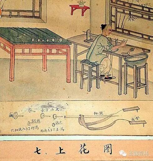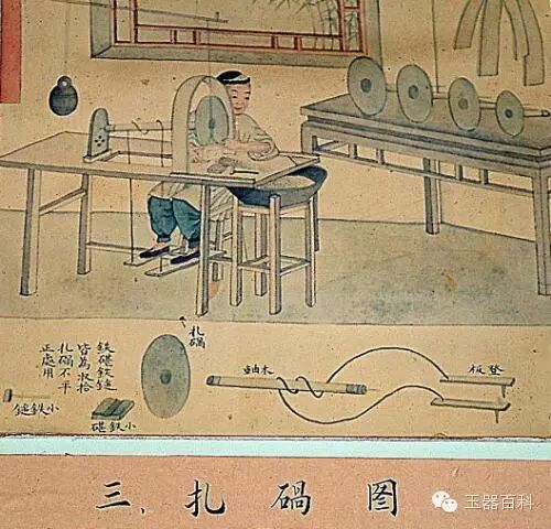 玉工坐在「旋车」前,旋车上架着的工具,结构颇复杂。这组工具适用长木棍(又叫木轴)的一端,装上圆形的钢盘,这个钢盘就叫做「扎锅」。钢盘的周缘很薄,像刀口一样非常锋利。木轴上缠绕着两根绳子,绳子下端各系一片木板。这两片木板叫做「登板」。