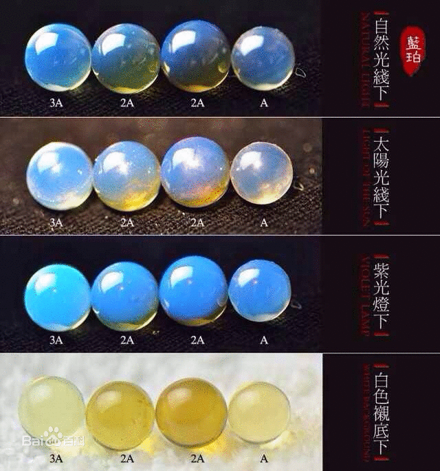 天空蓝及蓝紫是多米尼加蓝珀特有的颜色。在波长380-450nm的长波紫外线下会出现强烈的白蓝色Milky Blue萤光反应。这个方法直接点明了蓝珀神秘色彩的核心,因为这种琥珀中含有一种特殊物质“多环芳香分子”poly-nuclear aromatic molecules-蒽Anthracene这种暗藏在蓝珀内的“光感物质”,在受到外界的特定“入射光”照射激发后,吸收光能再释放出属于可见光范围的萤光(注),也就是我们肉眼所看见的蓝、绿或紫光。蓝色琥珀的奇特之处在于颜色变化多端,就好似调色板上的颜料以蓝色为基调,可恣意调配出浅蓝,深蓝,天蓝,紫罗蓝,海水蓝,湛蓝,红蓝,黄蓝,绿蓝等十多种以上的色彩变化,有时甚至在同一块蓝珀原矿中便可见到三种以上不同的“蓝”。