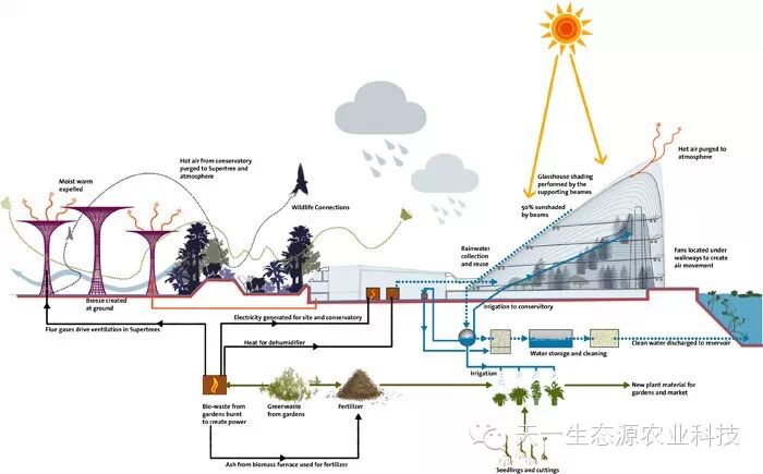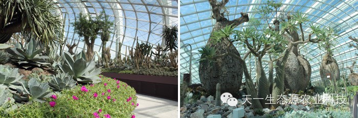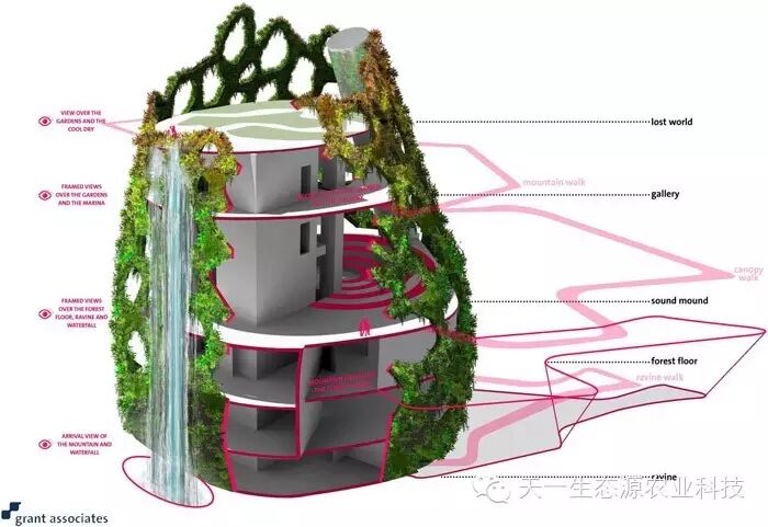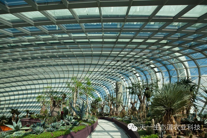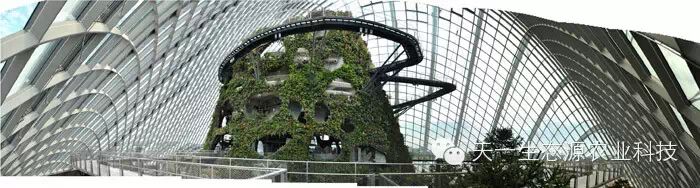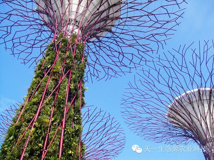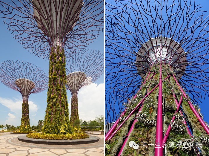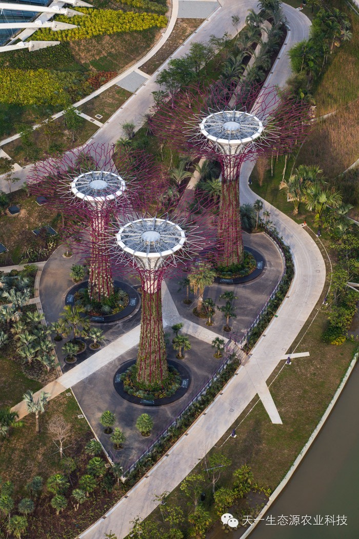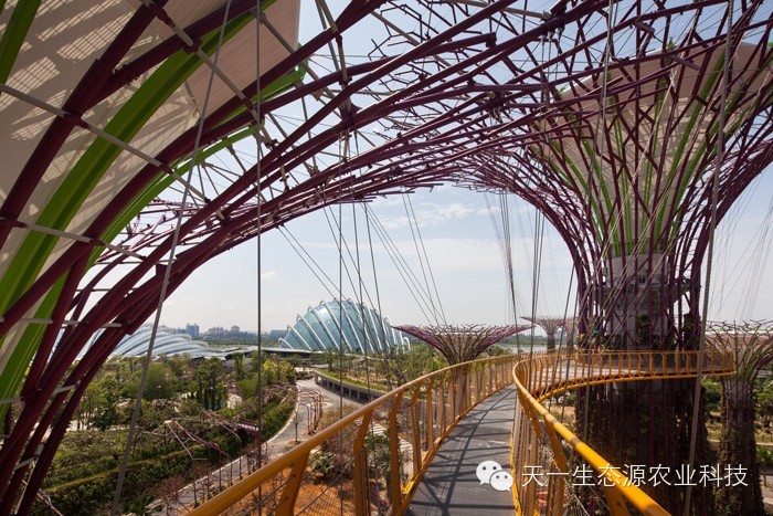 攀缘植物,附生植物还有蕨类植物成长在上面。白天,这些结构带来荫凉,夜晚,这些结构发出光辉。一条飘逸曲折的人行桥凌空穿梭在这些结构间,给人们全新的视野,让大家可以观赏到海湾全景。
