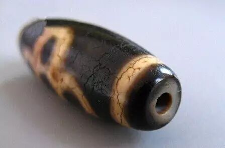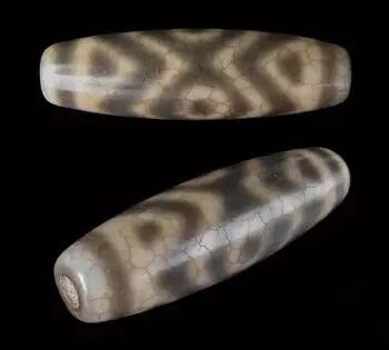 第四型鑲蝕玛瑙中间白化后上黑底:第四型鑲蝕玛瑙的製作是,(1)把能使玛瑙产生白化的添料。添在玛瑙的中间部分,两边保留不添任何的原石部分。在加热之的后,玛瑙的中间部分变成白色。(2)然后是在白色的区域,添上加热后变成黑色纹图案的涂料,在加热后,就成了第四型鑲蝕玛瑙了!据说,大部分比较好的天珠,都是用这种方式作成的。用这种方式做成的天珠,在黑色与白色的部分不透光。而在末添上涂料的两端部分是透光的。依笔者的盼断,第四型鑲蝕玛瑙的製作,主要是受到天然玛瑙原石的限制;这是因为玛瑙原石本身的美丽;工匠本身不想要完全的遮蔽它的石色的美丽,并且可使天珠有比较多样的花色变化。变得多彩多姿。我们可以这样的理解:古玉在出土之后,大家都喜欢它的原色能暴露出来;如果是[满沁]_完全遮蔽了它的石色,反而是较不受重视的。