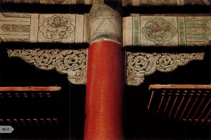 用大块整木制成,上部宽,逐步向下收分后,在底部还加一个大斗,然后再整体地放置于柱头上。