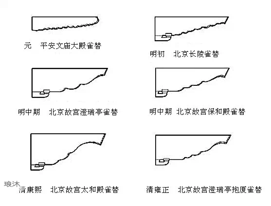 唐代建筑上不用雀替,宋、辽、金、元的一些高级建筑上也有不用雀替的实例。南北朝、宋代早中期和辽代的雀替质朴无华。宋、辽的一些雀替有上下二木构成。宋末和金代的雀替在其下部出现了蝉肚造型,元代的蝉肚造型最繁复,从明至清的蝉肚造型逐渐变简洁,但在底部另加一斗一拱。从明朝开始,雀替的前端部出现了鹰嘴突样式,鹰嘴突的造型在清代最显著。明、清的雀替不仅彩饰,还浮雕卷草和龙等图案。