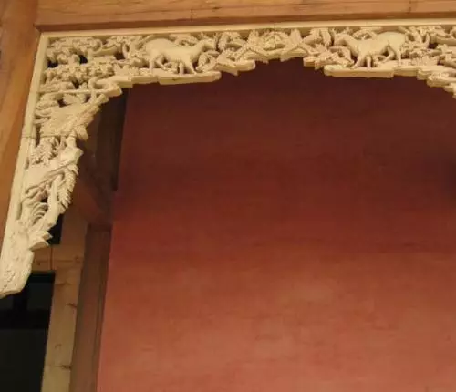 当二柱距较劲,并在梁柱交接处还要用雀替,此时两个雀替因距离过近而产生相碰连接的现象,骑马雀替就此形成。但其装饰意义远大于实用意义。