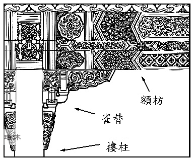 雀替是中国古建筑的特色构件之一。宋代称“角替”,清代称为“雀替”,又称为“插角”或“托木”。指置于梁枋下与立柱相交的短木,减少梁与柱相接处的向下剪力;防止横竖构材间的角度之倾斜。其制作材料由该建筑所用的主要建材所决定,如木建筑上用木雀替,石建筑上用石雀替。