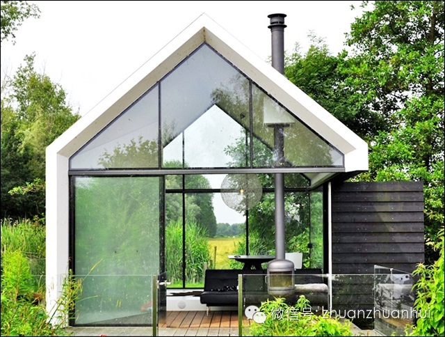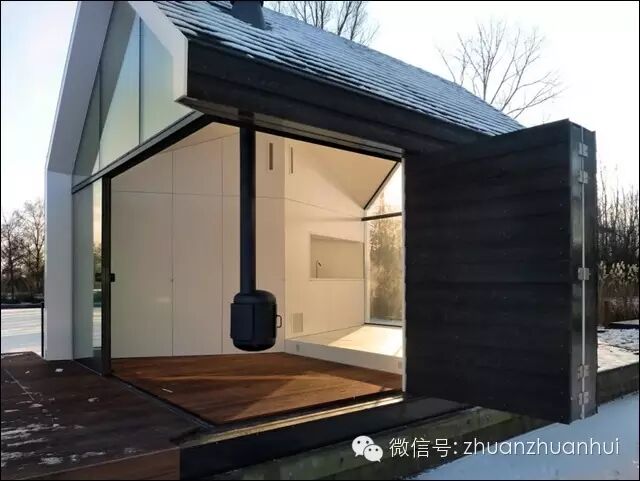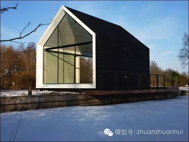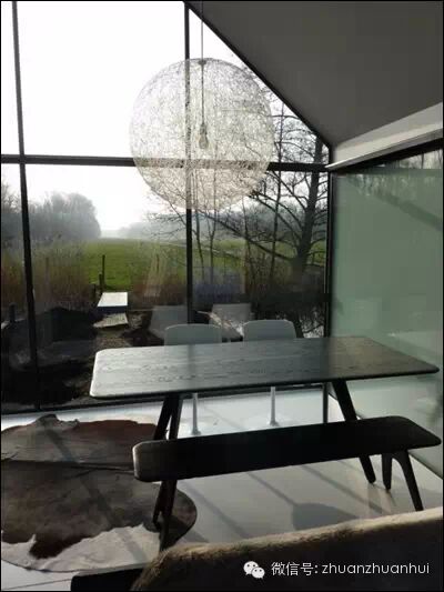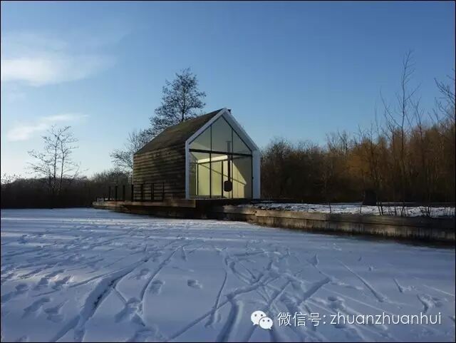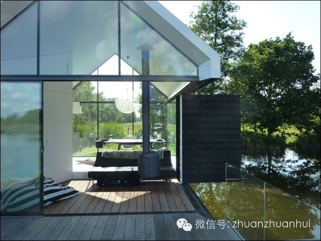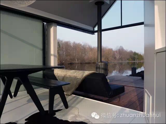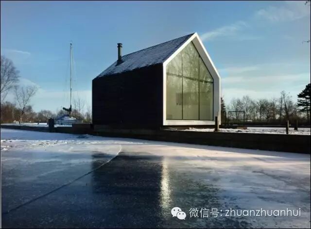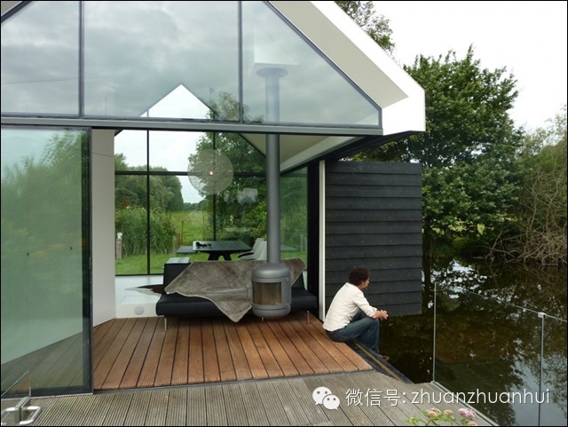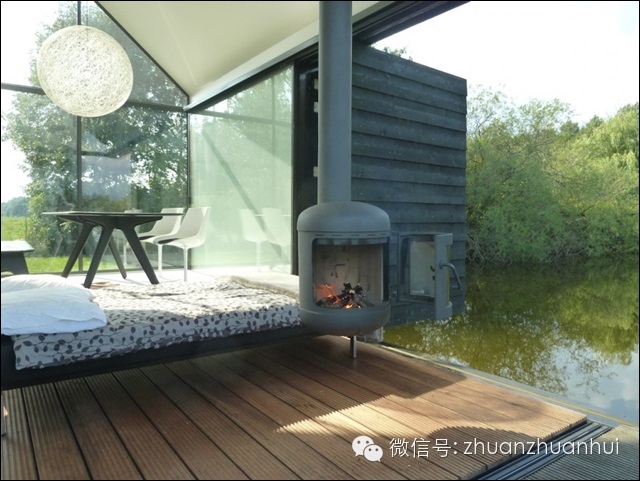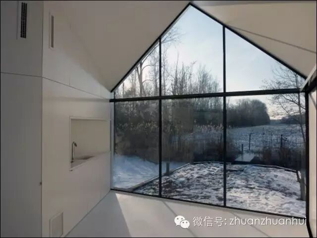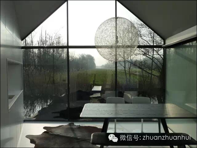 荷兰北部的冬天是很寒冷的,建筑师把立面全都转换成厚实的墙面,一个从天花板往下垂吊的壁炉,能随着气温高低、冬夏的转换,适时地转换方向。