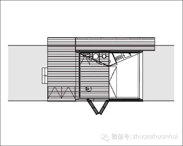 狭小的空间,机能却很健全,淋浴设施、厕所、厨房、储藏室、衣橱、都藏在两层的墙面中,多功能活动的墙面随时可以因为场景的需求而变换。室内的沙发床也能依照屋主的喜爱,移到可任意开启玻璃幕墙的户外区块。